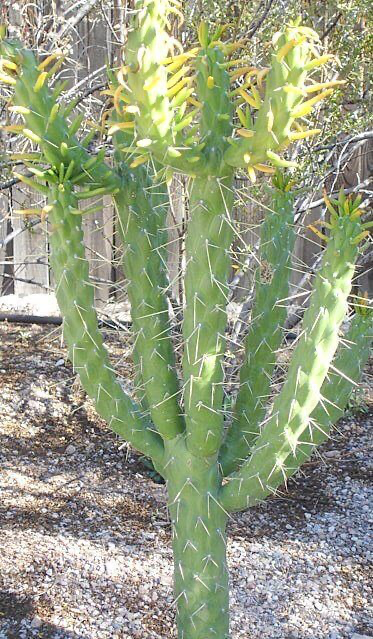 Characteristics: The branching, tree-like specimen grows to 13 feet tall and about t=10 feet wide, with cylindrical deep green leaves. New growth does not have many spines, but as the plant matures yellowish-red spines develop on its tip. The Eve’s needle will rarely bloom in cultivation, but when it does, it produces long, coppery red, showy blooms. Its fruit is oblong with small spines. Use it in attractive containers, raised beds, and cactus gardens, as a showy specimen in atriums, or as an understory plant.